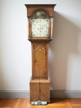A George III oak eight day longcase clock, the painted 13" dial signed 'G. Gowland, Sunderland', with pendulum and two weights, height 208 cm.