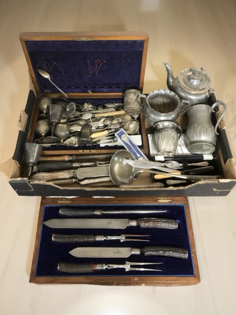 Assorted EPNS wares including cutlery, goblets, sifters, a tea set, a four piece antler handled carving set in fitted oak box, etc. (1 box)