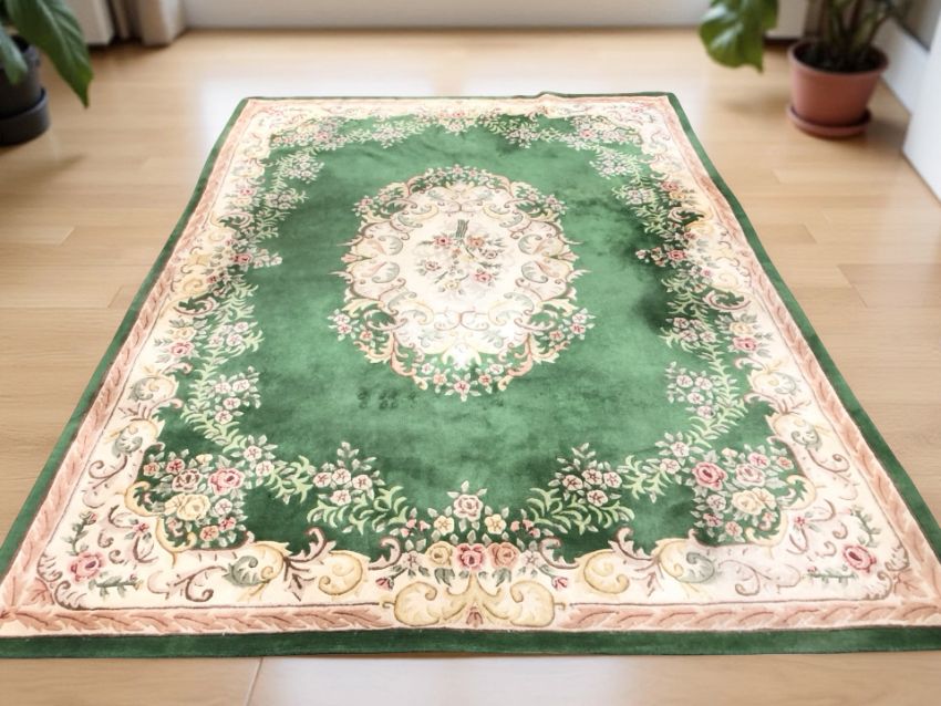 A machine made Chinese woollen carpet on green ground, 360 cm x 270 cm.