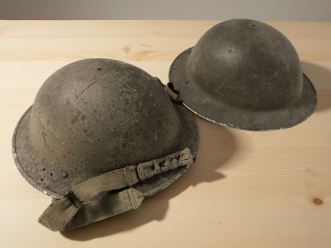 Two British military tin helmets.