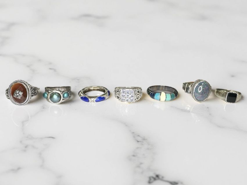 Seven silver/white metal dress rings, set with tanzanite, faux opal, enamel etc
