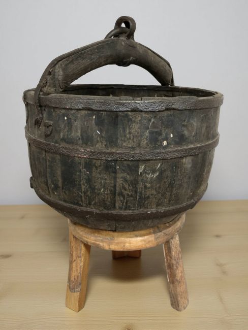 A 19th century oriental metal bound wooden water carrying bucket, diameter 50 cm, together with an associated tripod stand.