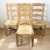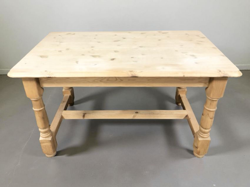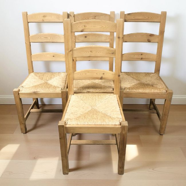 A reproduction pine farmhouse dining table, 133 cm x 79 cm x 76 cm, together with a set of four ladderback chairs with rush seats.