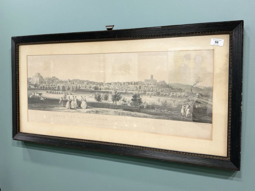 A 19th century monochrome print depicting the south view of Nottingham from the Rye Hills in 1741, 30 cm x 76 cm.
