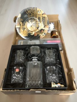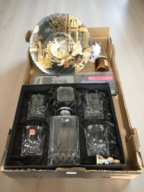 A Japanese Meiji Period papier maché plate depicting figures in traditional dress, an RCR crystal decanter and tumblers in box, various pens etc (one box)