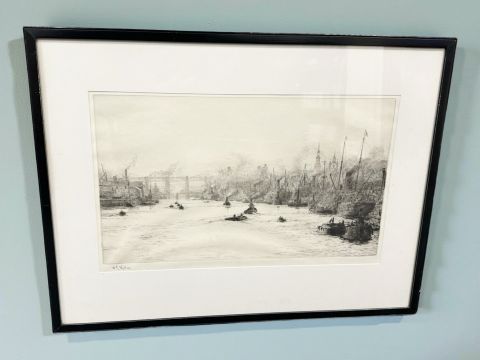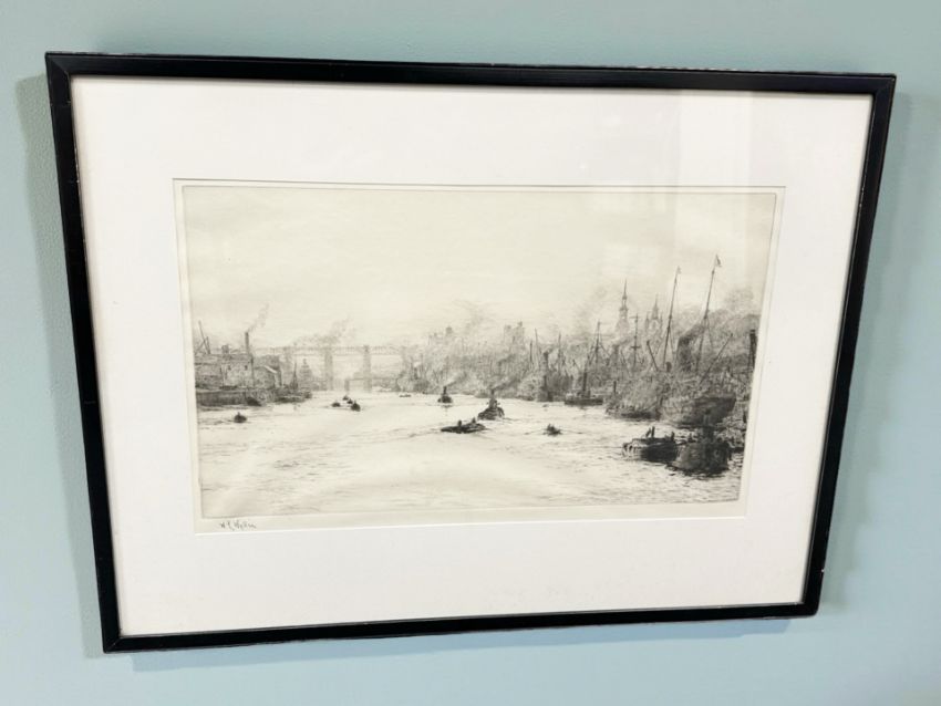 William Lionel Wyllie (1851-1931) : Shipping on The Tyne at Newcastle, drypoint etching, signed in pencil to bottom left, 22 cm x 38 cm, framed.