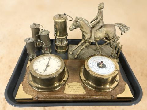A brass figure of a man on horseback, four various miner's lamps and a quartz timepiece and barometer mounted on an oak board.
