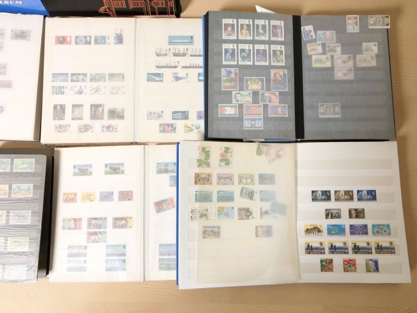 Twelve stamp albums and contents contained in a vintage suitcase.