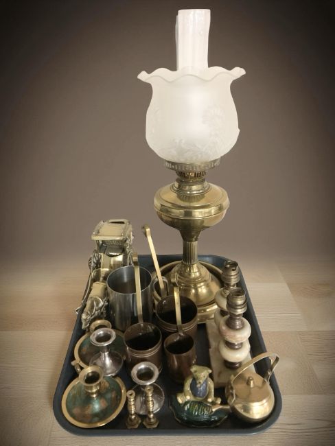 A brass oil lamp with frosted glass shade, further brass ornaments including a horse and carriage, pair of Indian enameled chamber sticks, two onyx mounted lamp bases, three graduated copper measures, etc.