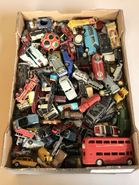 Various 20th century play worn die cast and tin plate vehicles, including Matchbox, Spot on by Triang etc (one box)