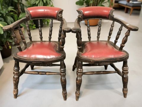 A pair of oxblood studded leather upholstered captain's style armchairs, width 60 cm.