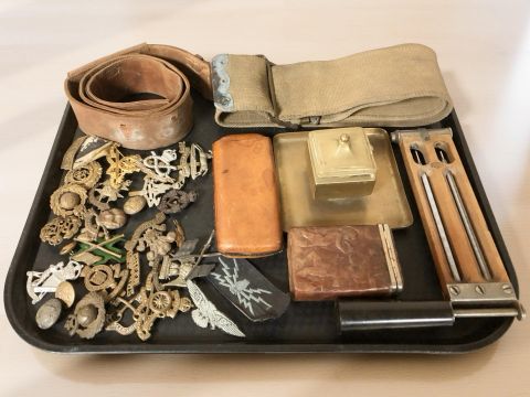 Assorted items including military cap badges, leather belt, canvas belt, a brass ink well, a leather cigar case, etc.