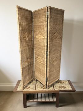 A teak drop leaf tile inset coffee table with undershelf, and a wicker threefold screen.