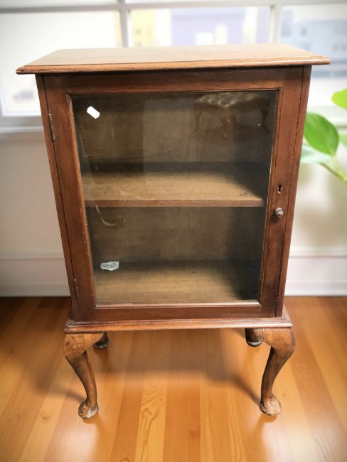 A glazed single door display cabinet on cabriole legs, width 59 cm.
