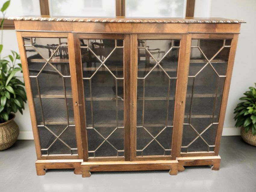 An early 20th century mahogany break front four door bookcase with astral glazed doors, 153 cm x 35 cm x 122 cm.
