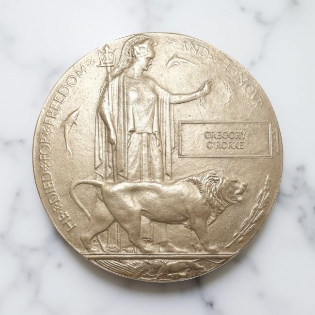A World War I bronze death penny, named to Gregory O'Rorke.