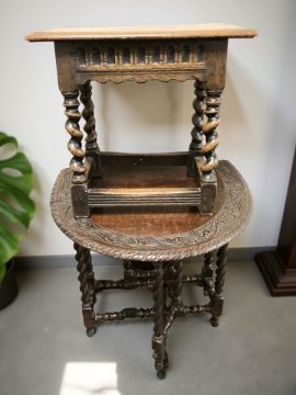 A carved oak drop leaf gate leg table, width 83 cm together with a barley twist stool