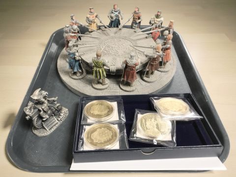 A resin ornament of the knight's of the round table, together with a cast pewter fantasy figurine and a group of gold plated royal commemorative coins.