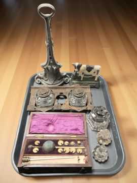 A group of antique ink wells, a T B Winter & Son, Newcastle hygrometer, and two cast metal door stops.