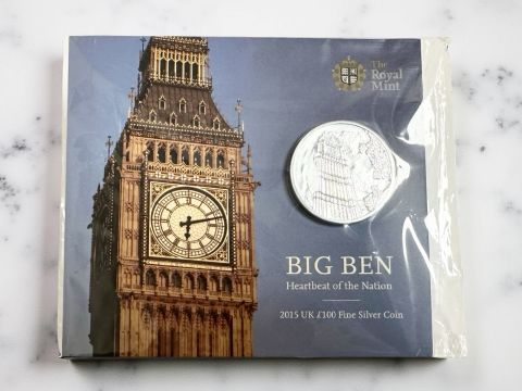 The Royal Mint : UK £100 Fine Silver Coin - Big Ben, 2015, 62.86g, in card slip, with documentation.