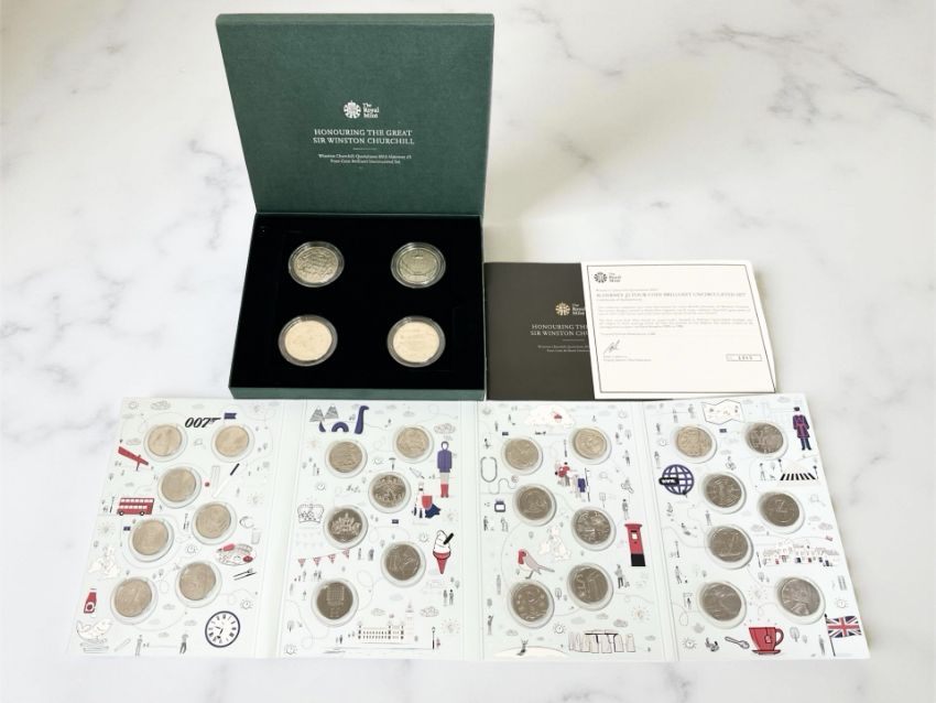 The Royal Mint : Honouring The Great Sir Winston Churchill - Winston Churchill Quotations 2015 Alderney £4 Four-Coin Brilliant Uncirculated Set, with documentation, in presentation box, together with The Great British Coin Hunt Quintessentially British A to Z Celebrating the Best of Great Britain ... Letter by Letter ... Coin by Coin, comprising twenty six 10 pence coins. (2)