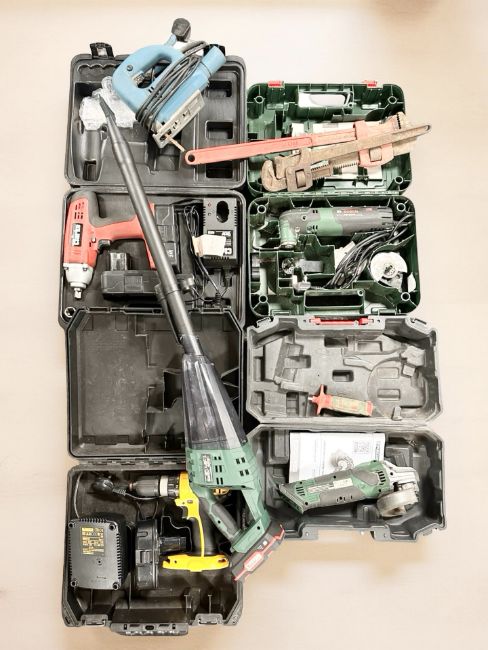 Five various boxed power tools including Dewalt, Clarke and Bosch, together with a Parkside stick vacuum cleaner and two wrenches