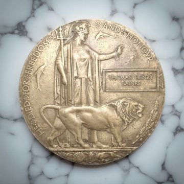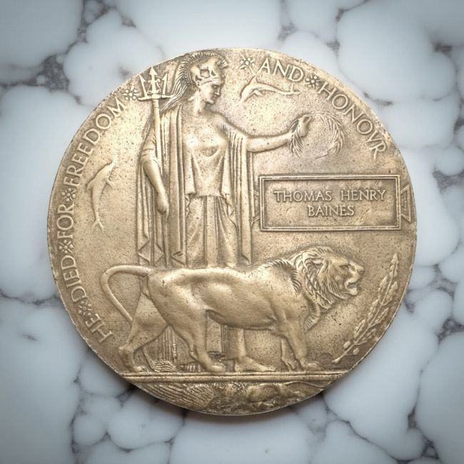 A World War I bronze death penny, named to Thomas Henry Baines *Most likely 204371 Thomas Henry Baines, Northumberland Fusiliers, 22nd (Tyneside Scottish) Battalion, KIA 21 Mar 1918. Or possibly 12883 Thomas Henry Baines, Loyal North Lancashire Regiment, 10th Battalion, Died of Wounds 13th March 1916.