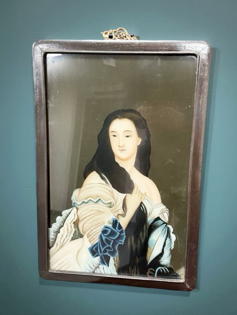 A Chinese reverse painting on glass depicting a female figure in flowing dress, 35 cm x 52 cm.