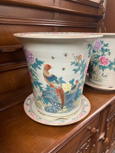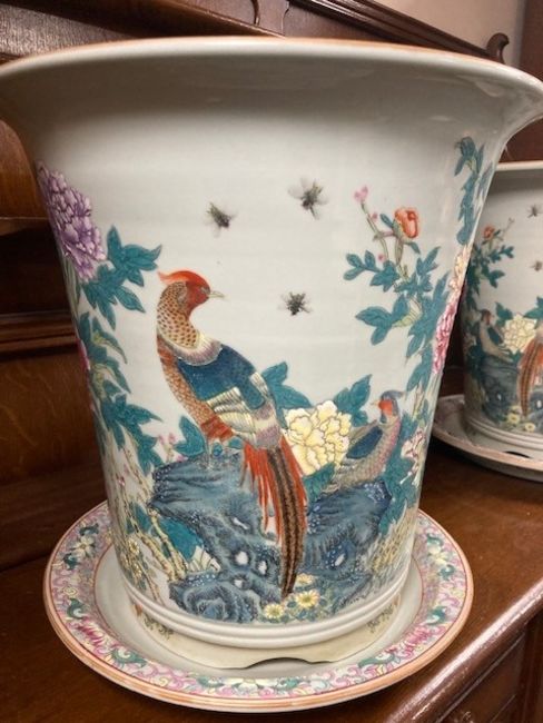 A large pair of 20th century Chinese celadon glaze famille rose porcelain planters on circular stands, decorated with pheasants amongst chrysanthemum blossoms, the circular stands with Qianlong seal mark in underglaze red, overall height 39 cm.