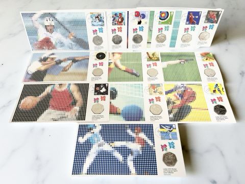 The Royal Mint : London 2012 Olympics and Paralympic Sports - A collection of thirteen 50 pence coins in cover slips - Shooting, Basketball, Taekwondo, Goalball, Cycling, Hockey, Modern Pentathlon, Canoeing, Boxing, Weightlifting, Archery, Handball and Wrestling. (13)