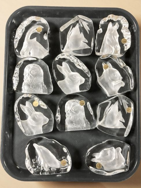 Eleven French Cristal D'Arques glass animal paperweights.