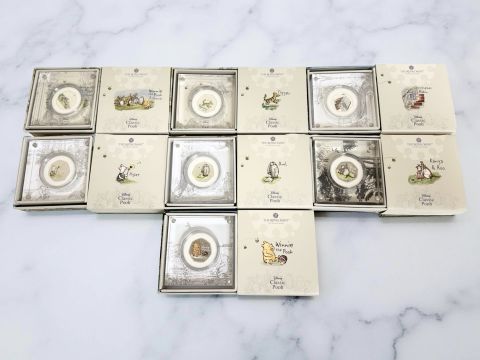 The Royal Mint : A Collection of seven Disney Classic Pooh 50 Pence Silver Proof Coins - Owl, Tiger, Kanga & Roo, Piglet, Winnie the Pooh, Winnie the Pooh & Friends and Christopher Robin, all with documentation, all boxed. (7) (Overall weight 56g)