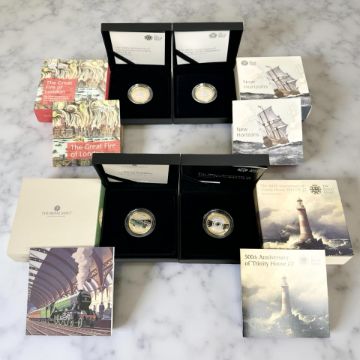 The Royal Mint : A Collection of four £2 Silver Proof Coins - The 500'th Anniversary of Trinity House, New Horizons, The Great Fire of London and The Centenary of Flying Scotsman, all with documentation, all boxed. (4) (Overall weight 48g)