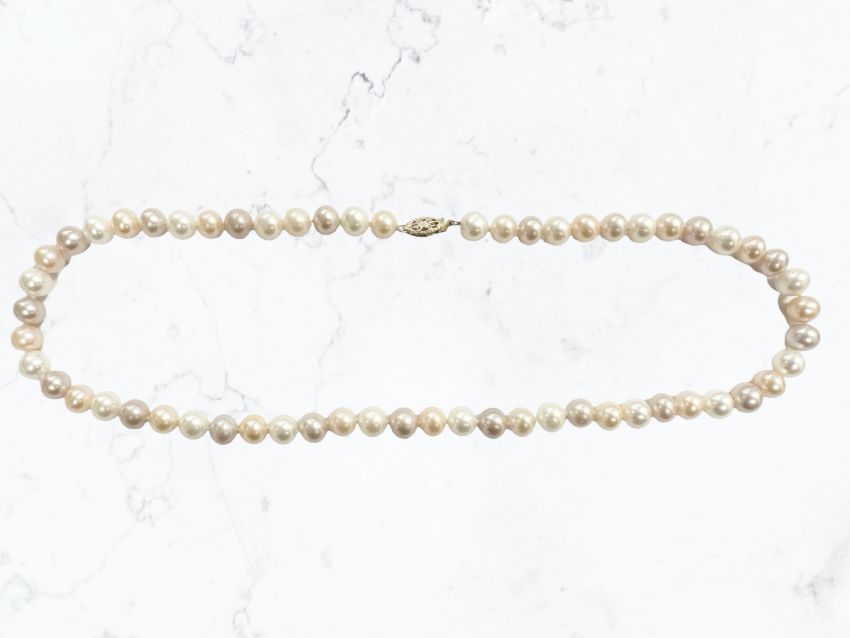 A cultured pink pearl single-strand necklace with gold clasp stamped 375, length 44cm