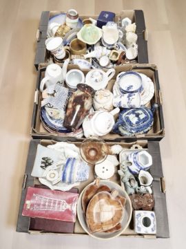 A large quantity of ceramics, teapots, blue and white items, collector's plates, pottery items (3 boxes)