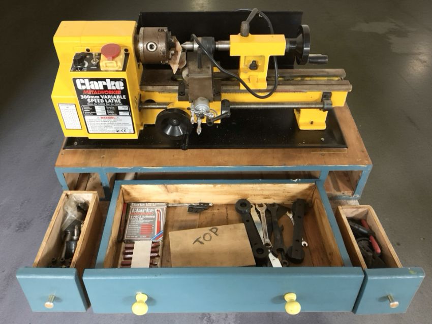 A Clarke Metalworker 300mm variable speed lathe, and a wooden three drawer chest containing hardware.
