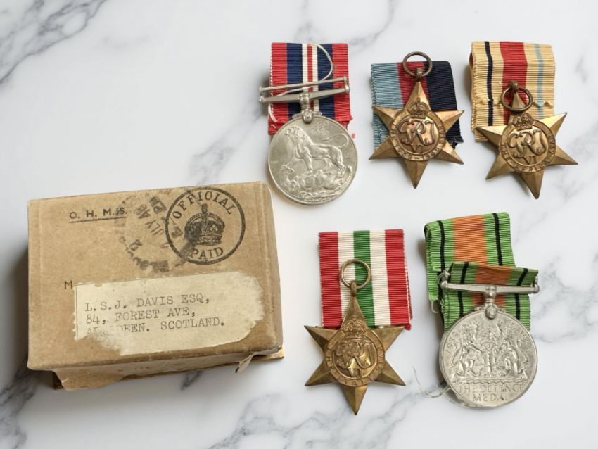 A group of WWII campaign medals, with box issued to L S J Davis, Aberdeen, Scotland