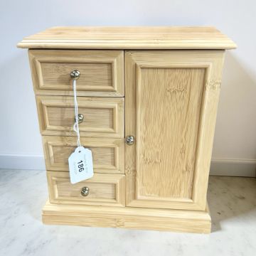 A beech effect four drawer jewellery box, with mirrored panel back, width 23 cm.