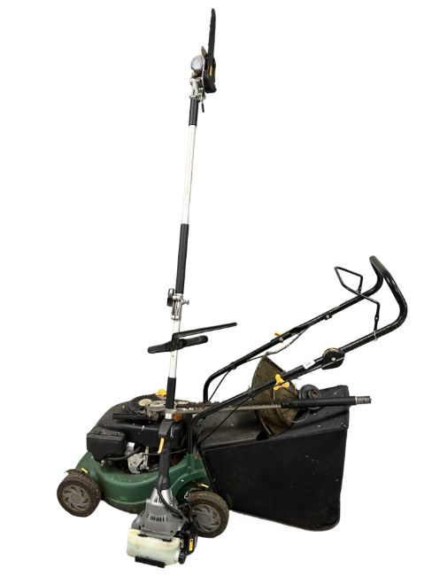 A petrol lawn mower and Titan 25cc multi tool with chain saw, hedge trimmer and grass strimmer attachments