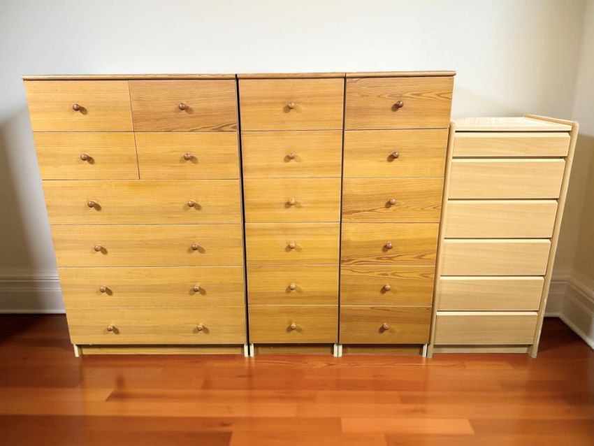 A contemporary Scandinavian pine effect eight drawer chest, 81 cm x 41 cm x 126 cm, together with two matching six drawer chests and a further contemporary chest. (4)