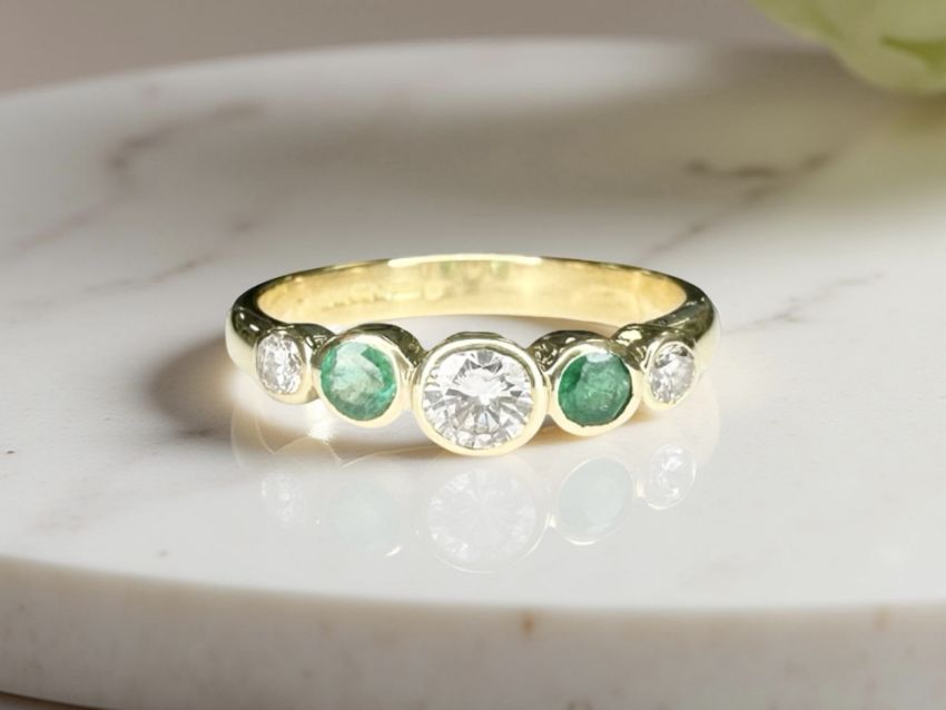 An 18ct gold emerald and diamond five-stone ring, size N