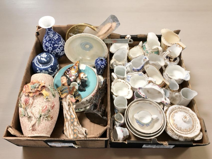 Assorted ceramics including a Chinese blue and white prunus ginger jar and cover, similar vase, various 19th century and later cream jugs, etc. (2 boxes)