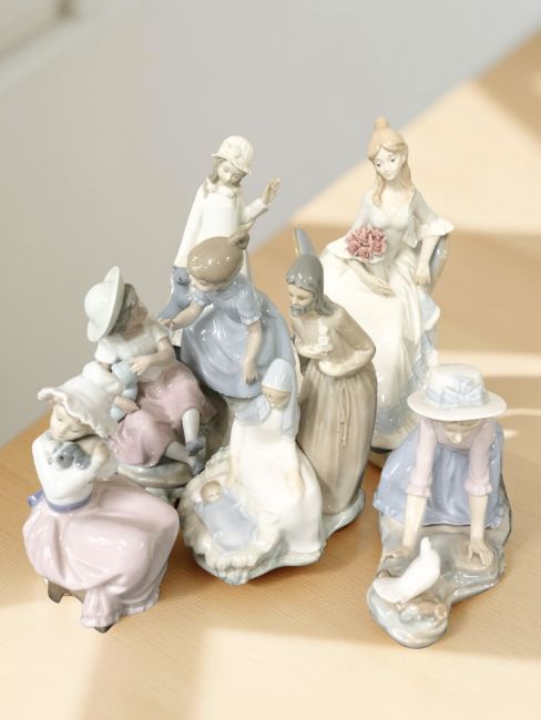 Four various Nao figures and groups including Jesus, Mary & Joseph, two further Spanish figures, one modelled as a seated lady holding roses, girl with puppy at her feet