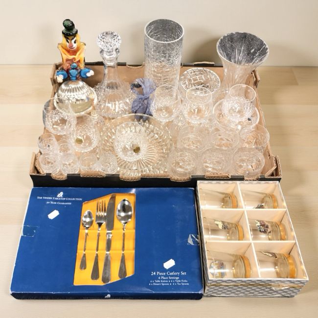 A group of crystal and glass ware to include French lead crystal glass, decanter, Murano clown, Viner's table top collection cutlery set, mid 20th century glass tumblers depicting The Houses of Parliament, London.