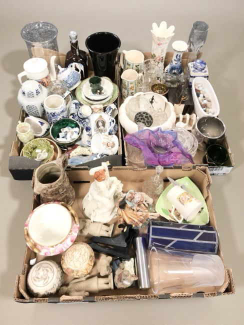 Assorted ceramics and glassware including Delft blue and white items, vases, figurines, Ringtons caddy, etc. (3 boxes)