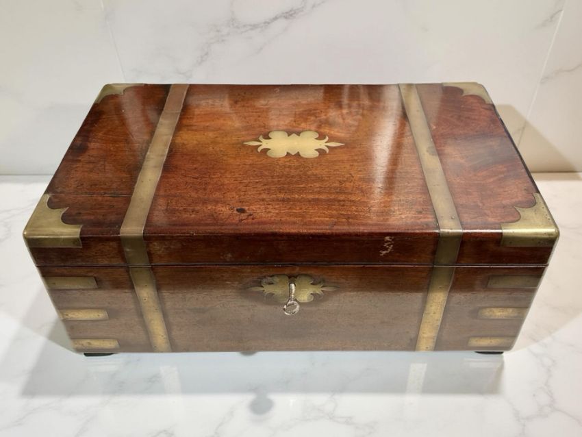 A Victorian mahogany brass-bound campaign writing slope, with tooled leather interior, with key, width 46cm.