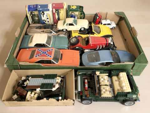 Assorted die cast vehicles including an Ertl 1:18 scale model of the General Lee from the Dukes of Hazard, other classic cars, a small quantity of LEGO, boxed die cast vehicles, etc. (1 box)