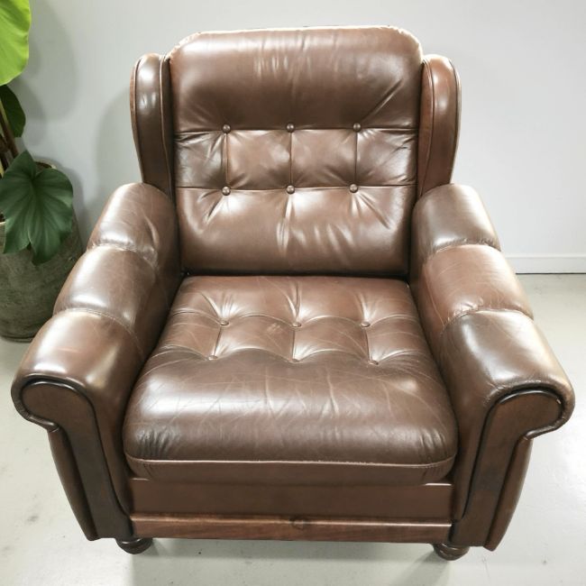 A Scandinavian three seater settee in deep buttoned brown leather, length 197 cm and a matching armchair
