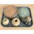 A group of Spanish porcelain figures, treen bowls and vases, South American style stone carving etc (2 trays)