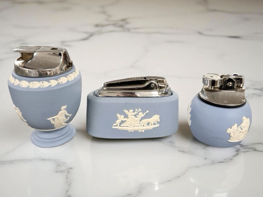Three Wedgwood blue and white Jasperware table lighters.